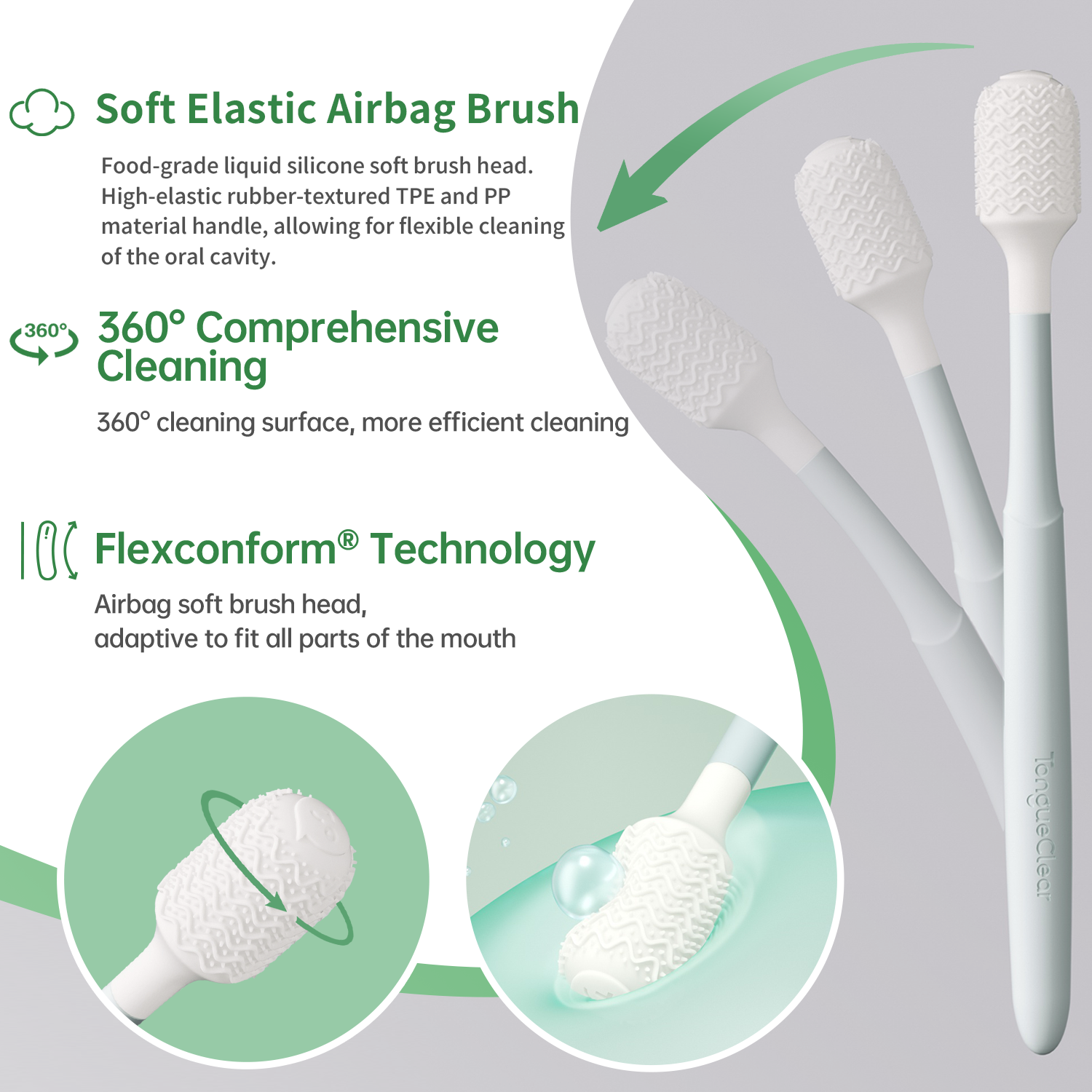 Tongueclear oral brush uses a 3D airbag brush head, which is a global design innovation. The brush head can flexibly fit any part of the mouth, including teeth, tongue, under the tongue, soft palate, hard palate, and the inner wall of the mouth, effectively removing residues and harmful bacteria in the mouth, and fully protecting your oral health. The high-quality liquid silicone brush head meets food-grade material standards, is not easy to breed bacteria, and is suitable for people with oral sensitivity.