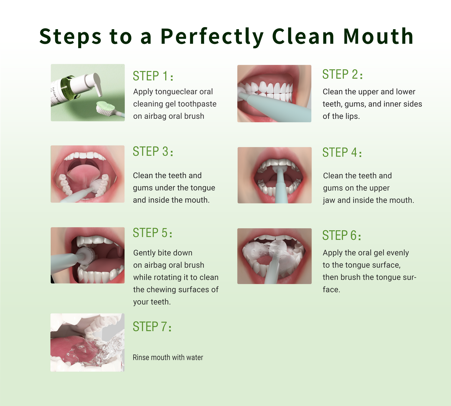 They are 100% free of SLS, antibiotics and analgesics, and are very friendly to people with sensitive teeth, gums and oral mucosa. We must understand that cleaning the oral mucosa is as important as cleaning the teeth, because if we only clean the teeth and ignore the oral mucosa, the teeth will still be contaminated by the biofilm on the oral mucosa and form dental plaque. Tongueclear airbag oral cleaner is not only a toothbrush and tongue brush, but also a mucosal brush (When using it as a toothbrush, make sure your oral muscles work closely with the airbag brush). Combined with a gel and utilizing the GIFTS cleaning method, it effectively cleans teeth, tongue, and other areas of the mouth, helping to prevent plaque, tartar, gingivitis, periodontitis, cavities, mouth ulcers, bad breath, and other oral health issues, making oral hygiene simple and effective.