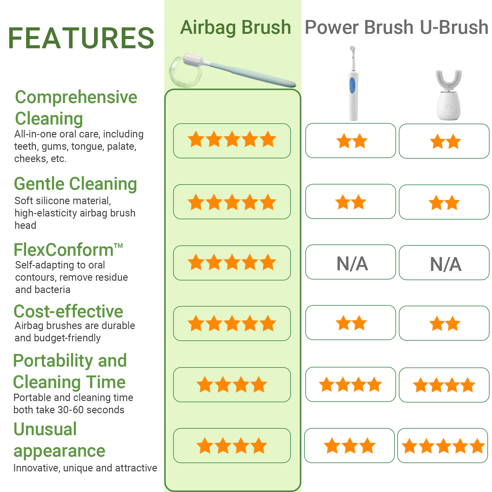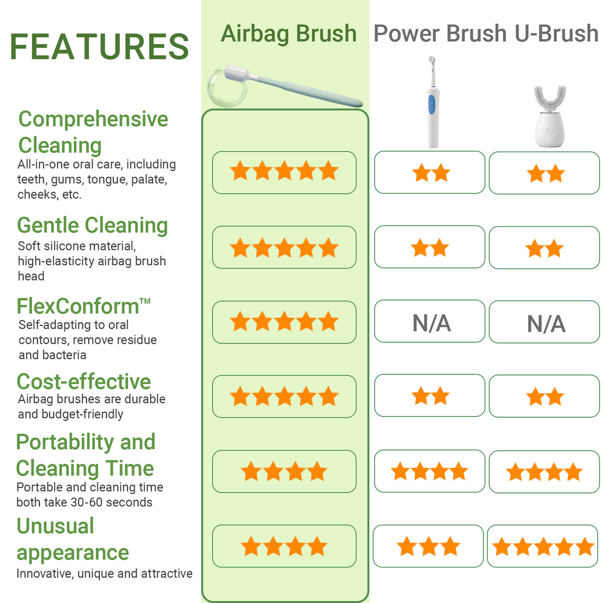 As someone who is obsessed with dental hygiene, I'm picky about tools. This airbag brush is fantastic. The shape is perfect for cleaning the back of the mouth which is usually hard to reach. It leaves your oral cavity feeling clean and fresh! It's effortless and works better than any electric brush I've tried for tongue cleaning.