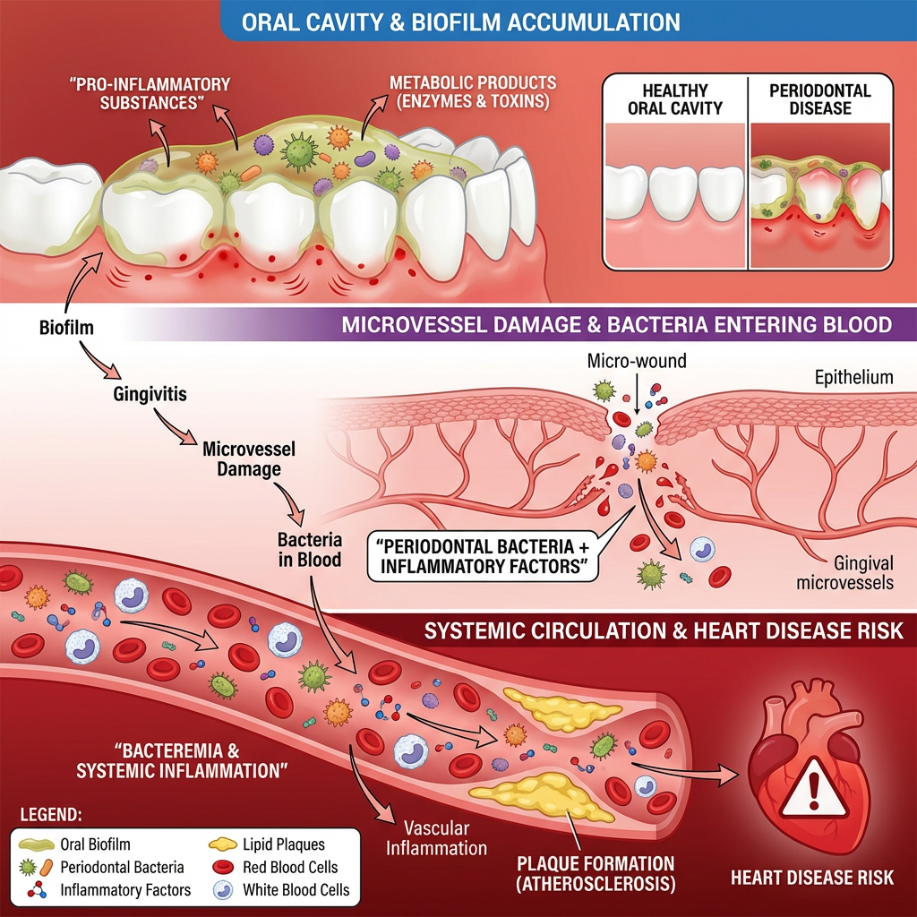 When the gums are chronically irritated, capillaries rupture, causing minor bleeding; epithelial cells also break down, forming small wounds. Periodontal bacteria enter the bloodstream through these wounds. These bacteria and inflammatory factors trigger vascular inflammation and may even participate in the formation of arterial plaques. Over time, the accumulation of vascular problems increases the risk of heart disease. This is why periodontitis is linked to the risk of heart disease.