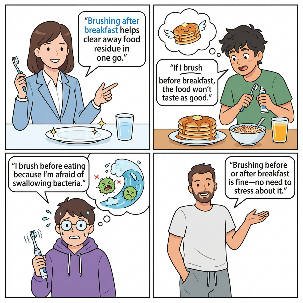 ② Others insist on brushing before breakfast, believing that breakfast tastes bland without brushing or that brushing after meals introduces bacteria.