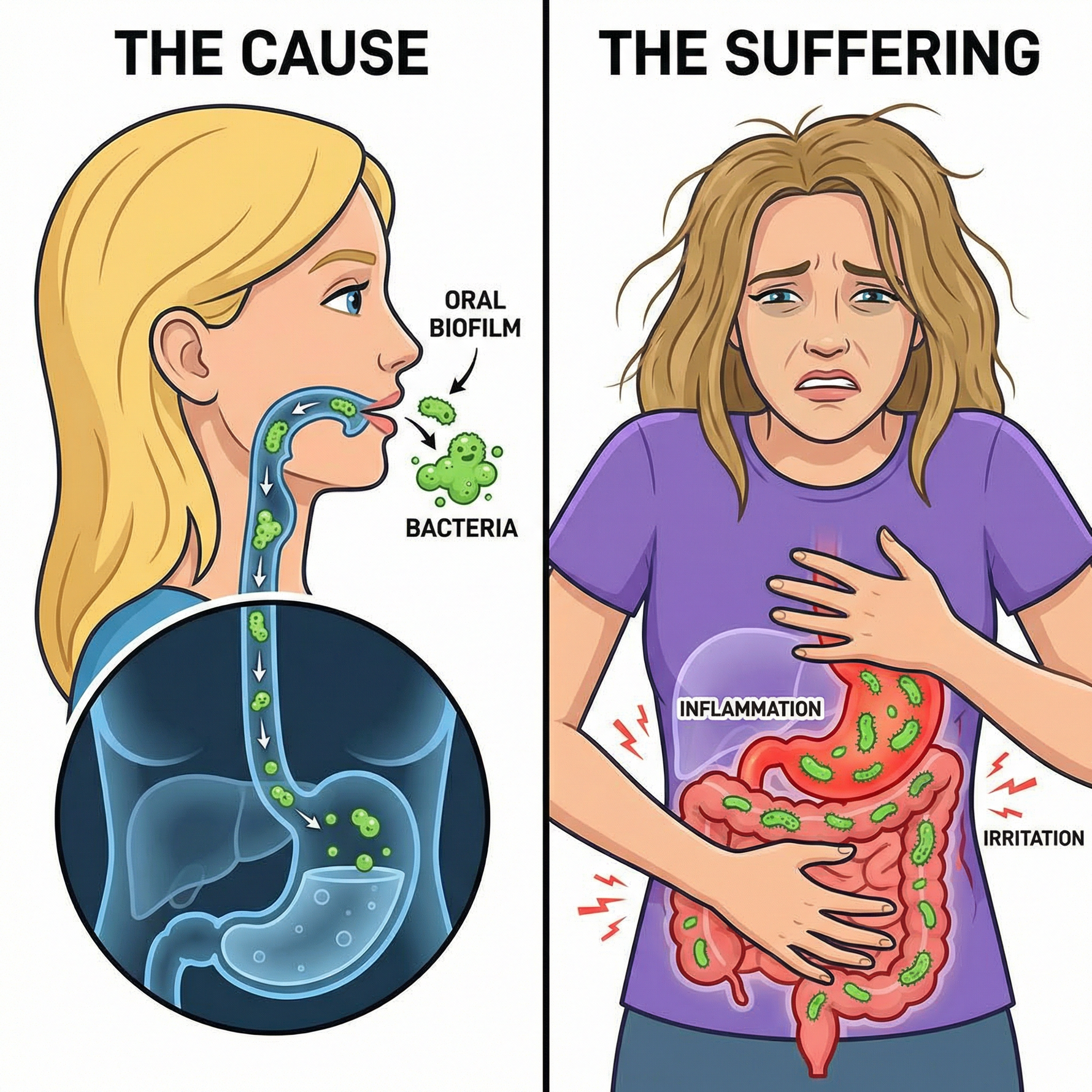 The biofilm in the mouth also enters the stomach and intestines during swallowing, affecting the gastrointestinal environment. Studies have found that people with poor oral hygiene are more prone to gastritis, stomach discomfort, indigestion, and other problems.