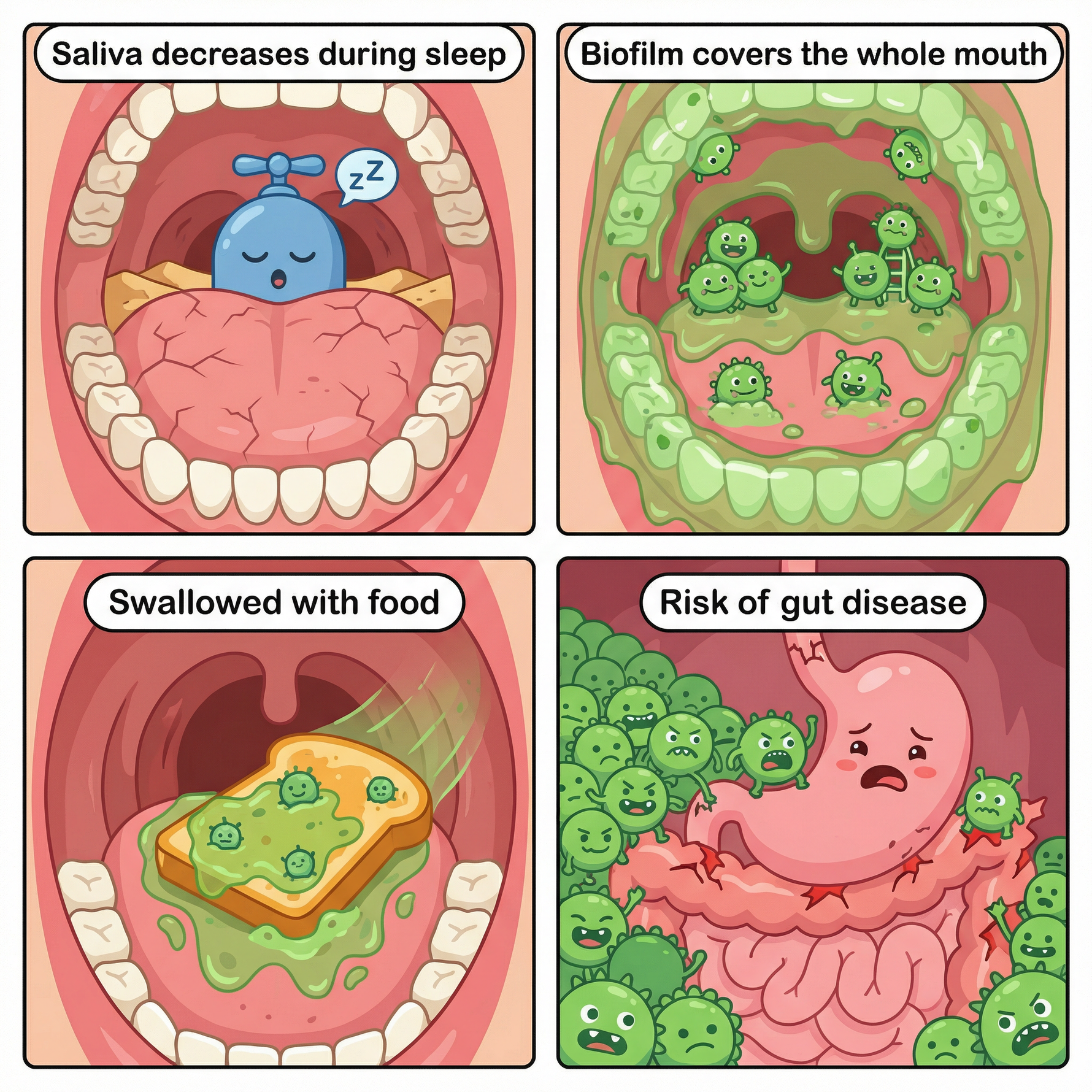 During sleep, saliva production decreases, reducing the mouth's self-cleaning ability, and biofilm accumulates significantly. Eating with an uncleaned mouth means swallowing a large amount of detached biofilm along with the food, increasing the risk of intestinal diseases.