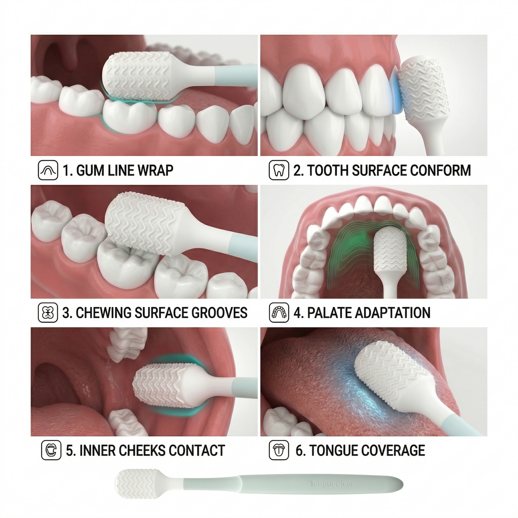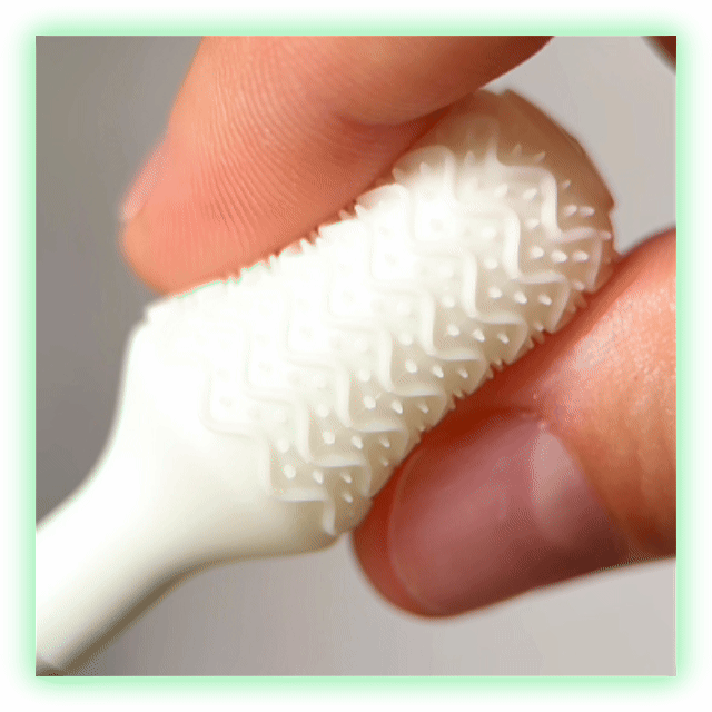 You might be wondering: will it hurt the soft tissues of my tongue, palate, or inner cheeks? Rest assured, the brush head is crafted from food-grade liquid silicone, delivering outstanding safety and unparalleled softness. You never have to worry about irritating your mouth's delicate tissues.