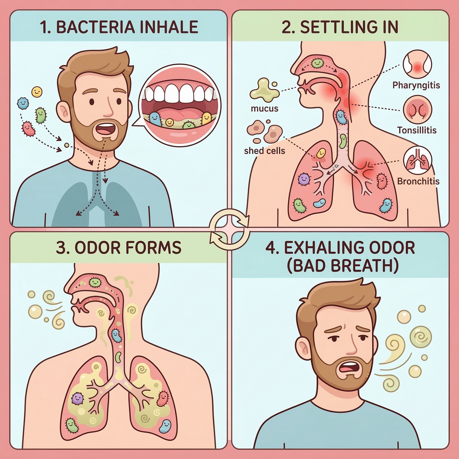 - Respiratory Problems: Biofilm bacteria inhaled into your respiratory tract can aggravate conditions like sinusitis and pharyngitis. The odor from this inflammation is then carried right back to your mouth every time you exhale.