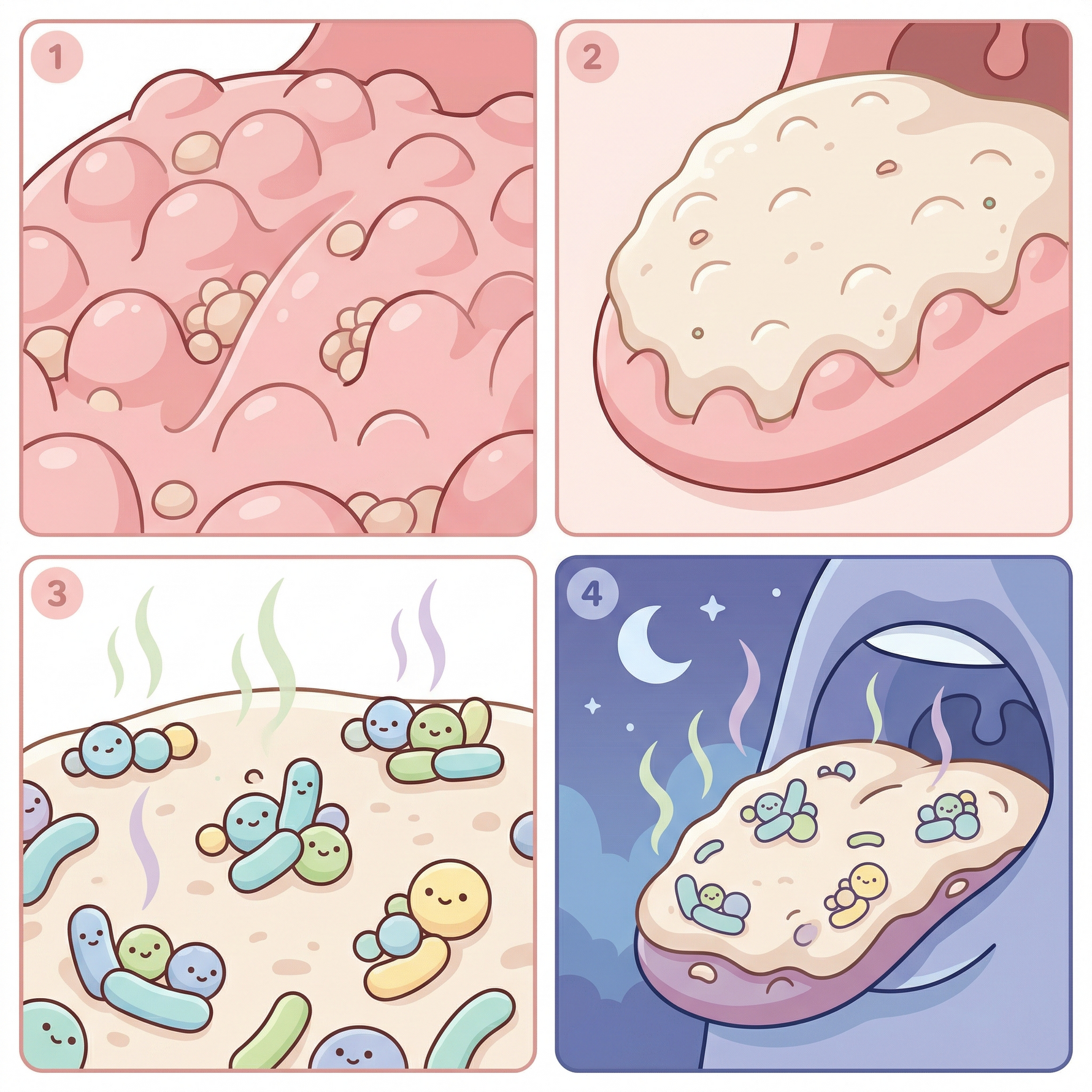 Breakdown: Next, the Lysozyme in the Oral Cleaning Gel goes to work, dismantling the biofilm's structure and deactivating odor-producing bacteria. This makes the biofilm effortless for the brush to remove.