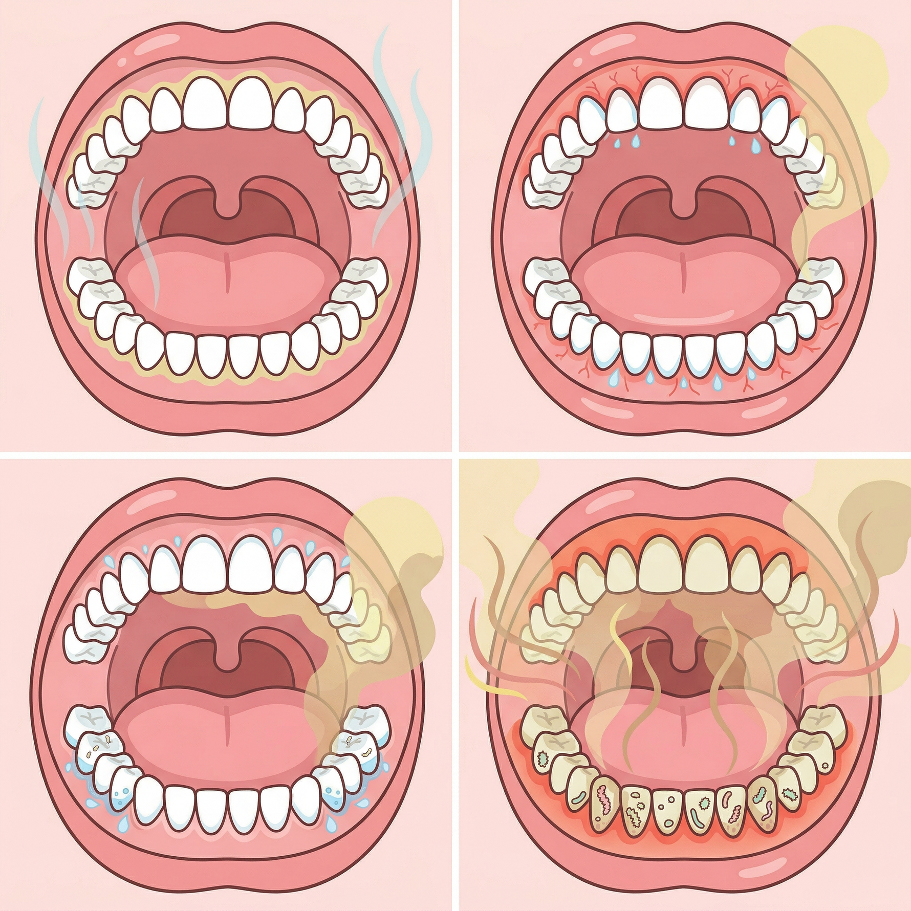 - Periodontal Disease: When biofilm-induced inflammation spreads deeper, it leads to gum disease, producing a strong, pungent smell of infection.