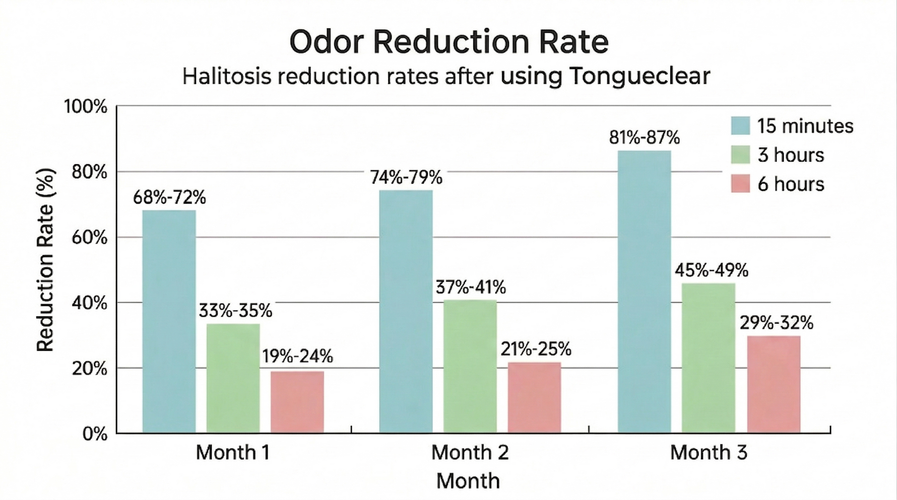 Based on monthly statistics, here is the reduction rate in bad breath values at 15 minutes, 3 hours, and 6 hours after using TongueClear