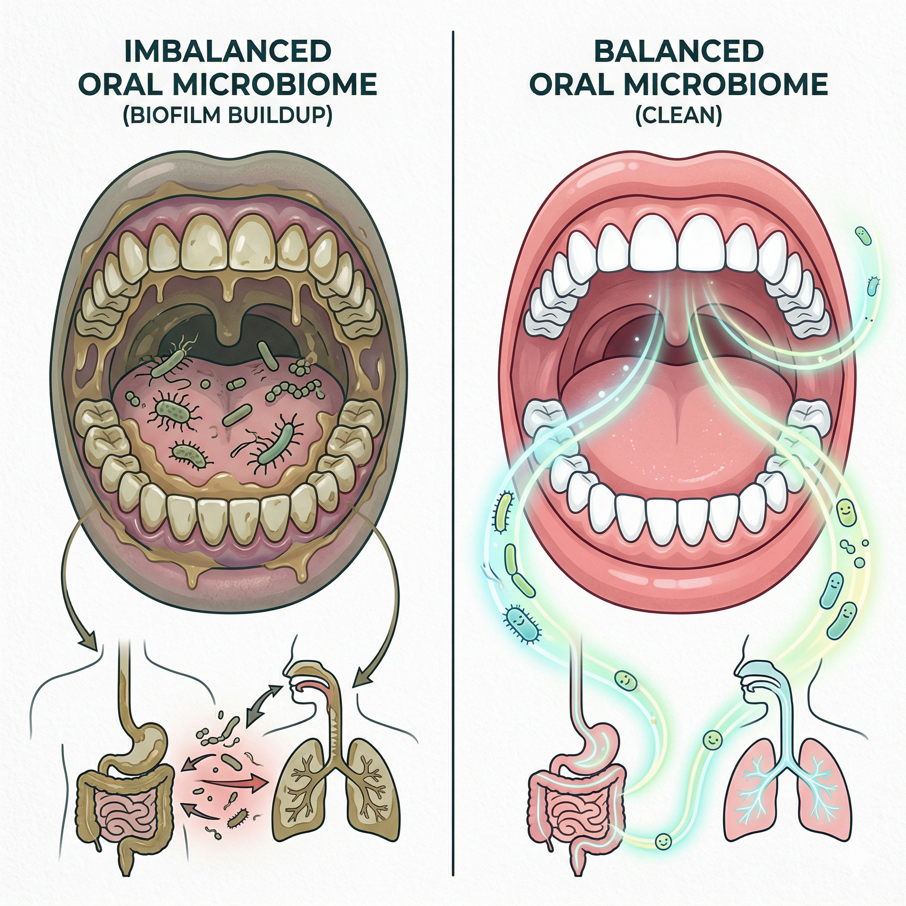 - Digestive Issues: Swallowing biofilm bacteria can disrupt your gut microbiome and even trigger acid reflux, pushing foul stomach gases back up into your mouth.