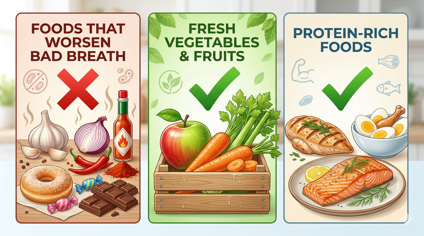 - Enjoy More: Apples, carrots, and celery (these stimulate saliva production and aid in natural cleaning). When adding protein, opt for fish and chicken, as they are less likely to contribute to oral odors.