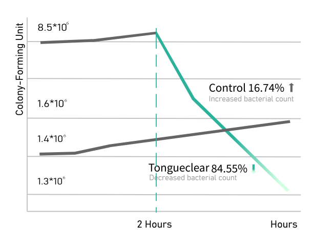 Compared to before use, after using TONGUECLEAR for 2 hours, the total number of bacterial colonies in TONGUECLEAR decreased by 84.55%.