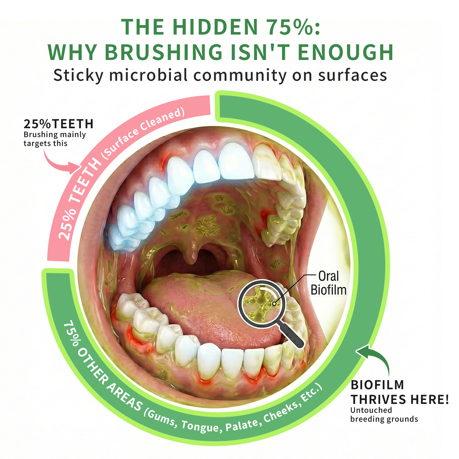 "This product has an innovative design for cleaning oral biofilm. Excessive biofilm accumulation is indeed a core cause of gingivitis, cavities, bad breath, and other diseases. Through the special airbag structure and enzyme gel toothpaste, it achieves gentle coverage of the entire oral cavity, including teeth, gums, and tongue, overcoming the limitations of traditional toothbrushes that only clean the teeth. My overall experience using it has been very comfortable, and the results are excellent. It's definitely worth trying."