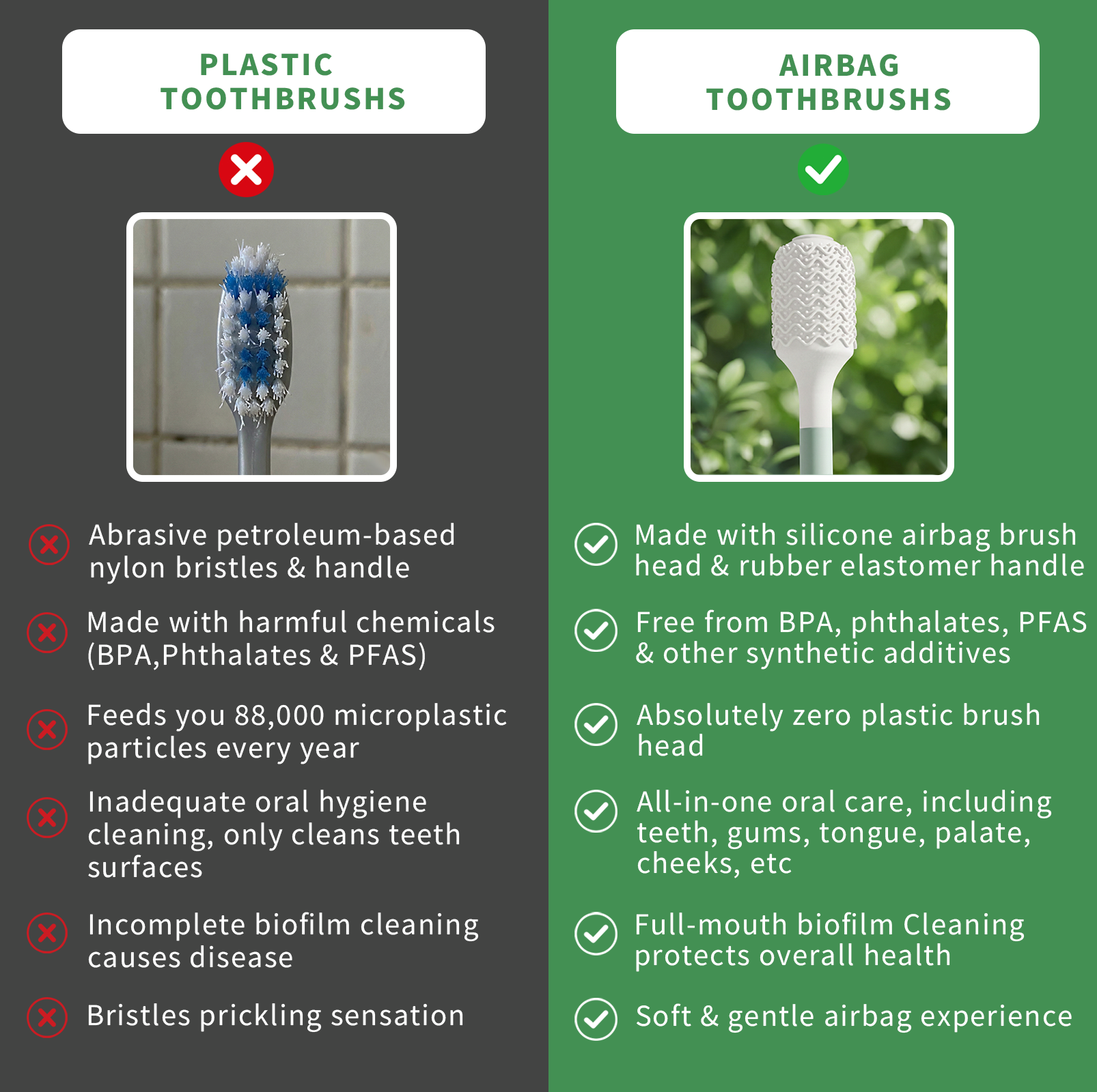 TongueClear® Airbag Oral Brush redefines the gentle revolution in oral cleaning. It abandons the friction logic of traditional bristles, centering on the world's first 3D airbag brush head. When in contact with the mouth, the soft airbag conforms to the contours of the teeth, gums, tongue, and every part of the oral cavity, achieving 360° cleaning.