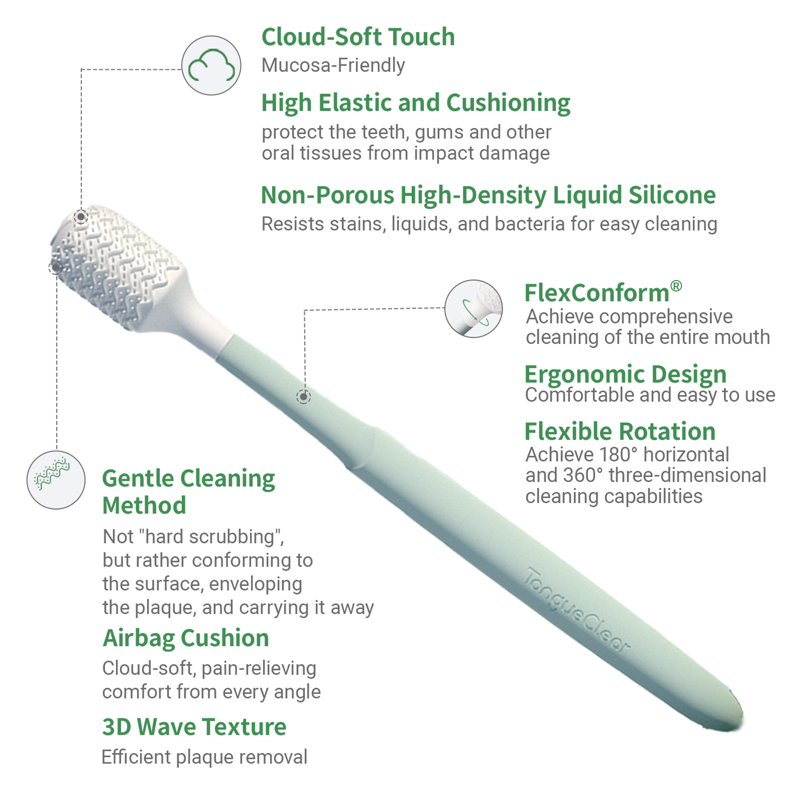 TongueClear® oral brush uses 3D airbag brush head, which is a global design innovation. The brush head can flexibly fit any part of the mouth, including the tongue, under the tongue, soft palate, hard palate, and the inner wall of the mouth, effectively removing residues and harmful bacteria in the mouth, and fully protecting your oral health. The high-quality liquid silicone brush head meets food-grade material standards, is not easy to breed bacteria, and is suitable for people with oral sensitivity.