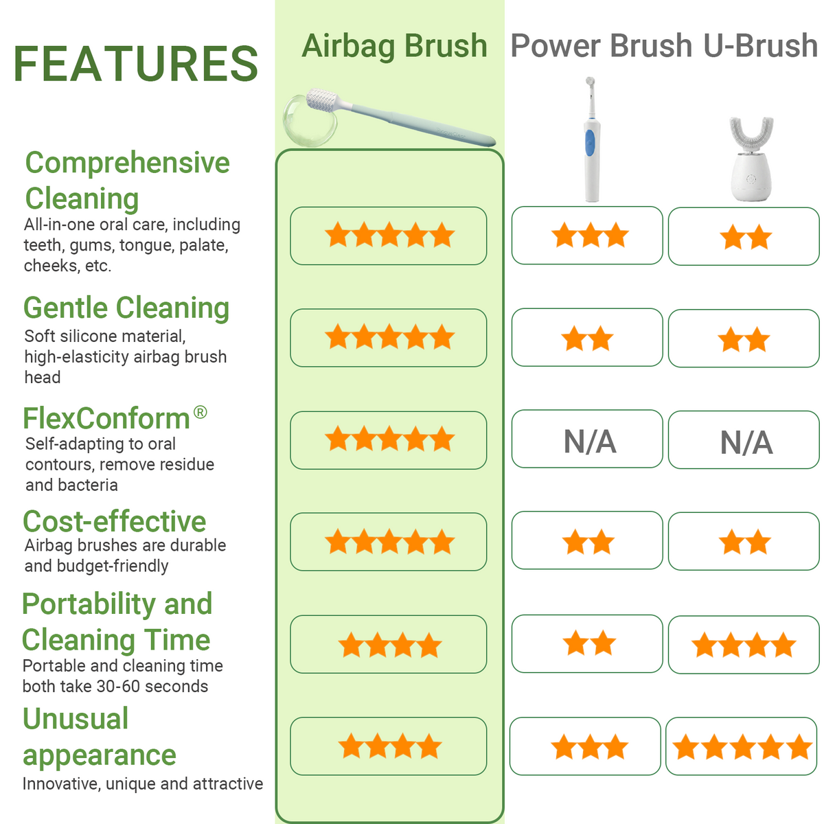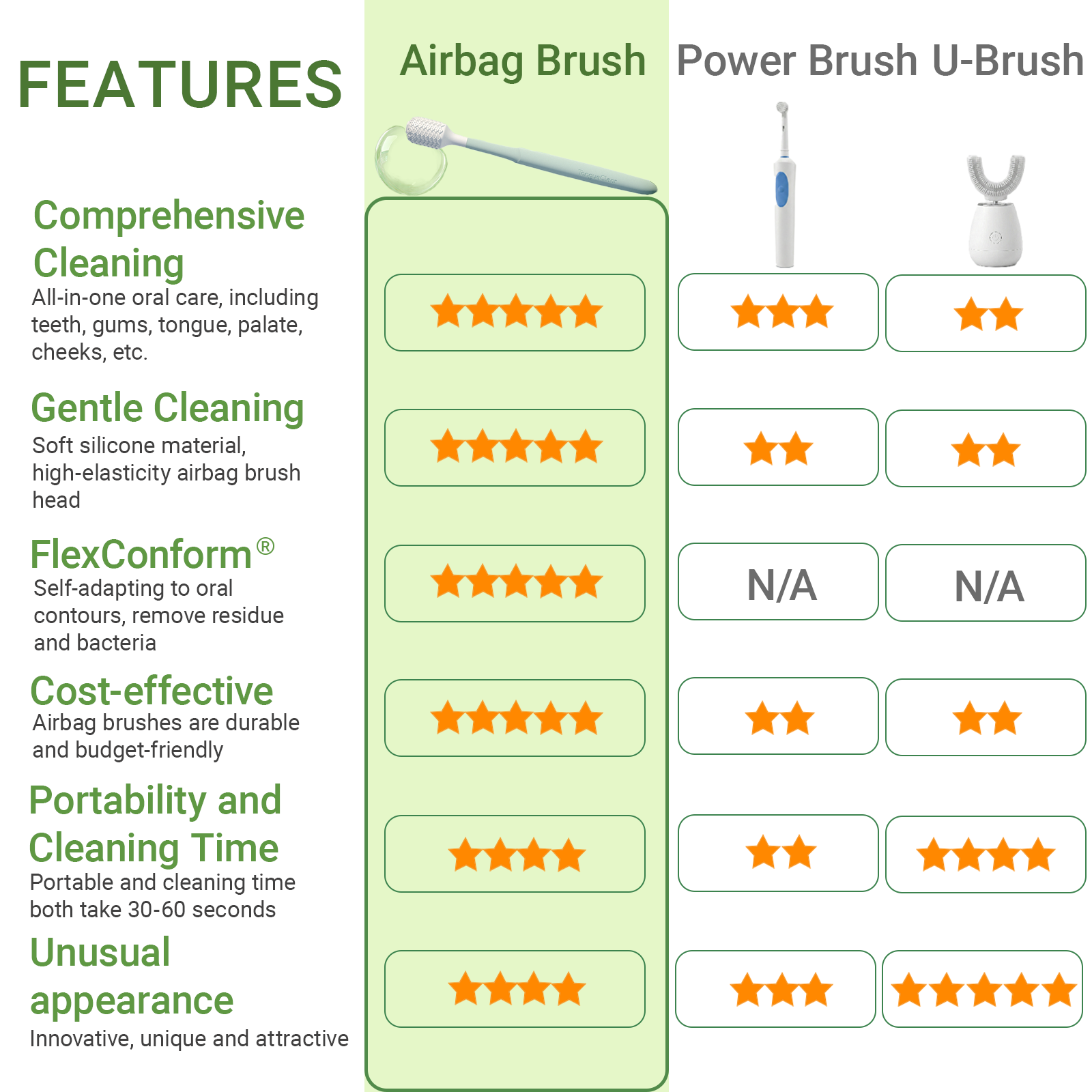 As someone who is obsessed with dental hygiene, I'm picky about tools. This airbag brush is fantastic. The shape is perfect for cleaning the back of the mouth which is usually hard to reach. It leaves your oral cavity feeling clean and fresh! It's effortless and works better than any electric brush I've tried for tongue cleaning.