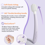 TongueClear® kids oral magic brush adopts the unique Flexconform adaptive fitting patented technology. The brush head is soft and deformable, and can actively fit the kid's tongue, gums, deciduous teeth, upper and lower jaws, clean the mouth without dead angles, and protect the delicate oral mucosa. The pacifier design is more acceptable to kids, and kids enjoy this feeling.