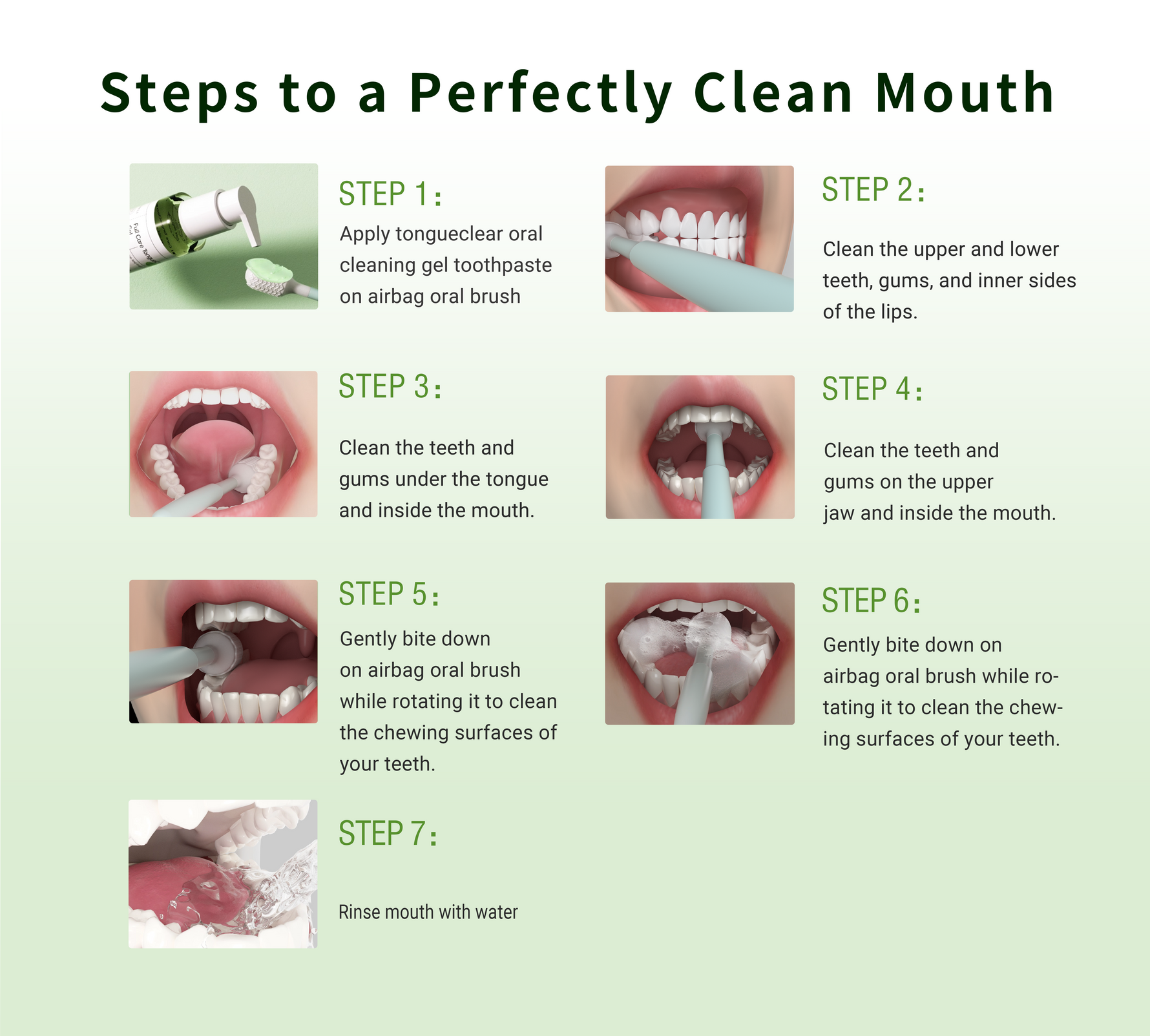 Tongueclear Oral Cleaning Gel's three main ingredients—amino acid table active, lysozyme, and glycosidase—help you remove oral biofilm without irritating your oral mucosa and teeth, effectively cleaning dental plaque and biofilm. It is 100% free of SLS, antibiotics and analgesics, and is very friendly to people with sensitive teeth, gums and oral mucosa. We must understand that cleaning the oral mucosa is as important as cleaning the teeth, because if we only clean the teeth and ignore the oral mucosa, the teeth will still be contaminated by the biofilm on the oral mucosa and form dental plaque. Tongueclear airbag oral cleaner is not only a toothbrush and tongue brush, but also a mucosal brush. Combined with a gel and utilizing the GIFTS cleaning method, it effectively cleans teeth, tongue, and other areas of the mouth, helping to prevent plaque, tartar, gingivitis, periodontitis, cavities, mouth ulcers, bad breath, and other oral health issues, making oral hygiene simple and effective.